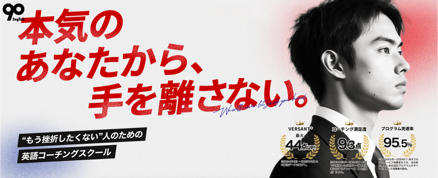 もしあなたがそんな悩みを抱えているなら、「90 English」がおすすめです!90 Englishは、"もう挫折したくない" あなたのために、徹底した伴走と科学的アプローチで「話せる英語」を習慣化するプログラムを提供しています。